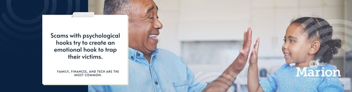 Scams with psychological hooks are the most common types of elder scams today. They all try to create an emotional hook to trap their victims. It might be the fear of financial loss, of a family member in trouble, or the allure of a phony romance.